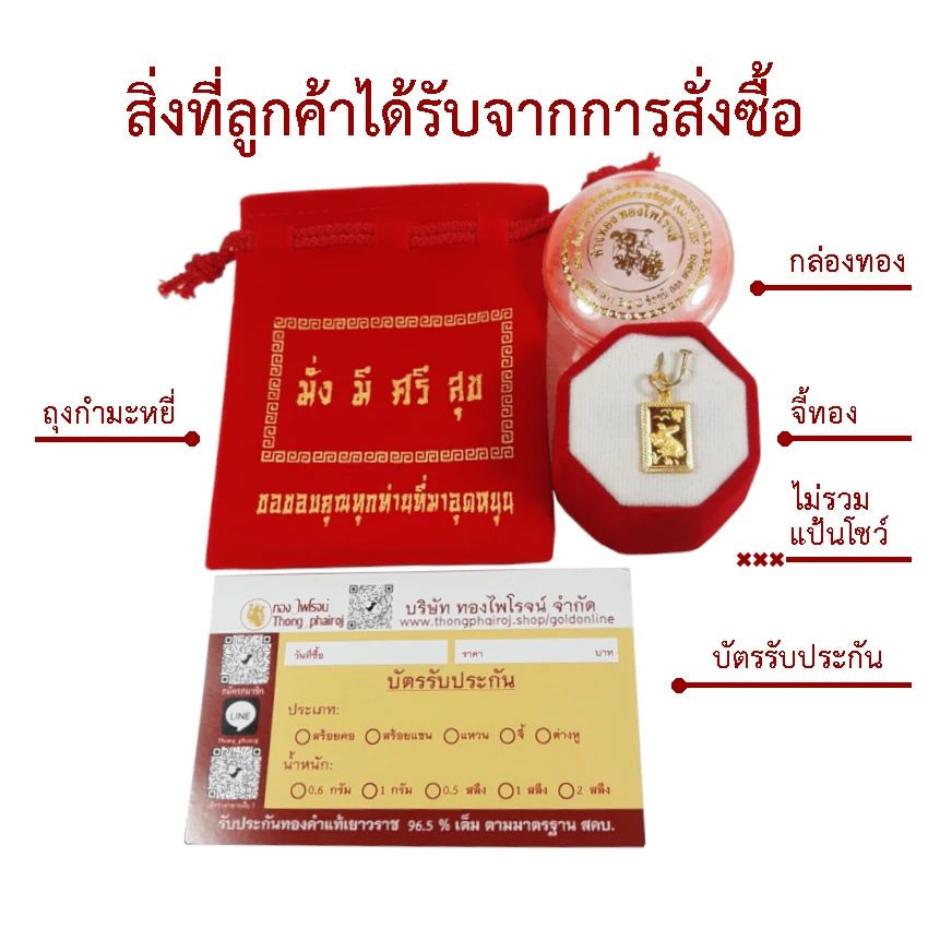 ฉลากสินค้า: จี้ทองคำ น้ำหนัก 1.89 กรัม (ครึ่งสลึง ) ผลิตจากทองแท่งบริสุทธิ์ 96.5% ความบริสุทธิ์ทองคำหลังหลอมรวมน้ำประสานทอง ไม่น้อยกว่า 92.5% ค่าแรง 300-500 บาท |